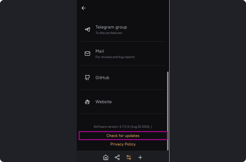 To update the application on Windows, you first need to download the new version to your device. To do this, open the application and go to the settings by finding the settings icon on the bottom panel. Select the section - "About Amnezia."