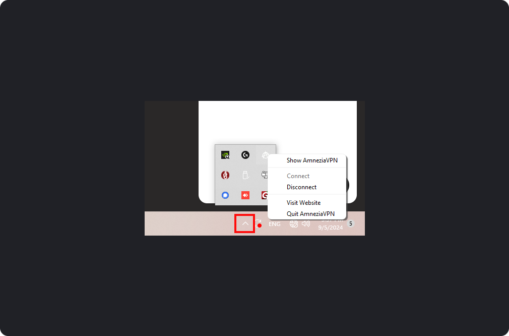 Open the tray (by clicking on the arrow on the bottom panel of Windows), find the Amnezia icon, right-click on it, and select "Close AmneziaVPN."