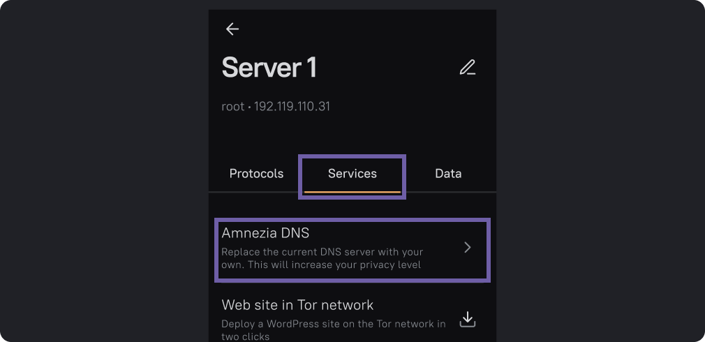 Select the Services tab. On the Services tab, select Amnezia DNS.