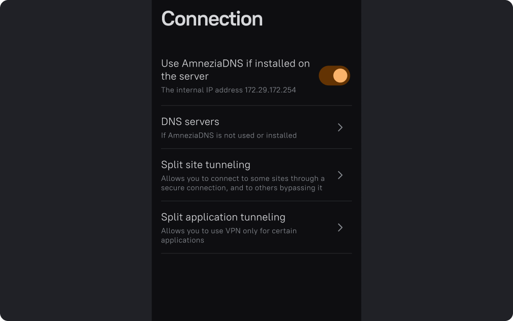 Here you can select "Use Amnezia DNS" , or you can use other DNS servers.