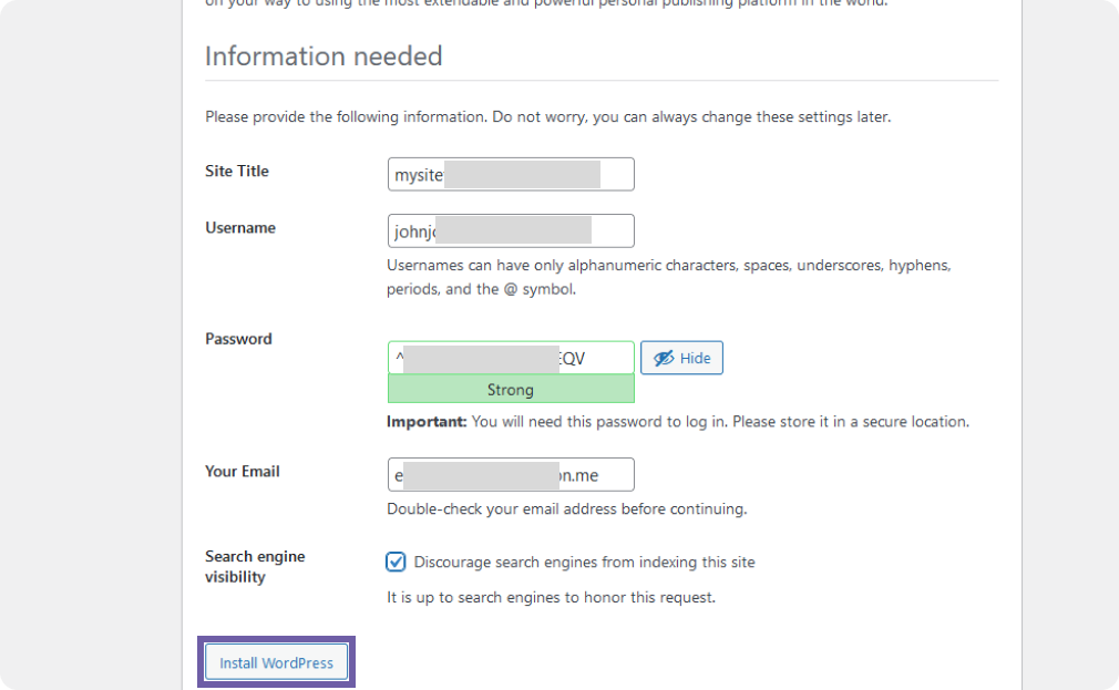 Come up with a name for the Site, enter your username as well as your e-mail, and don't forget to save your login password. Click "Install WordPress".