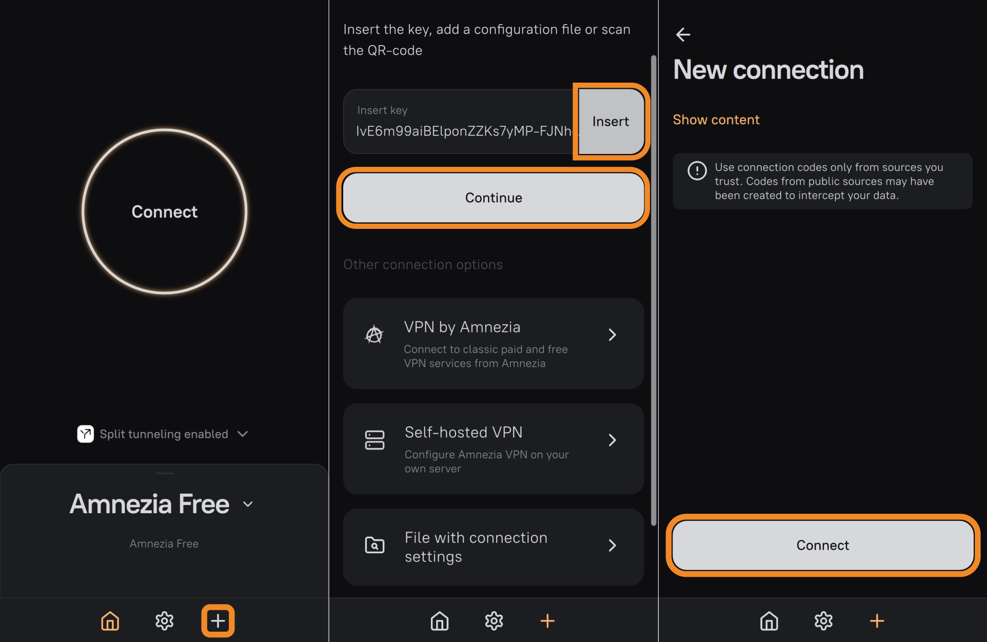 1. In the AmneziaVPN app, tap ➕ (plus icon) or tap Let's get started if you don't have any other connections.