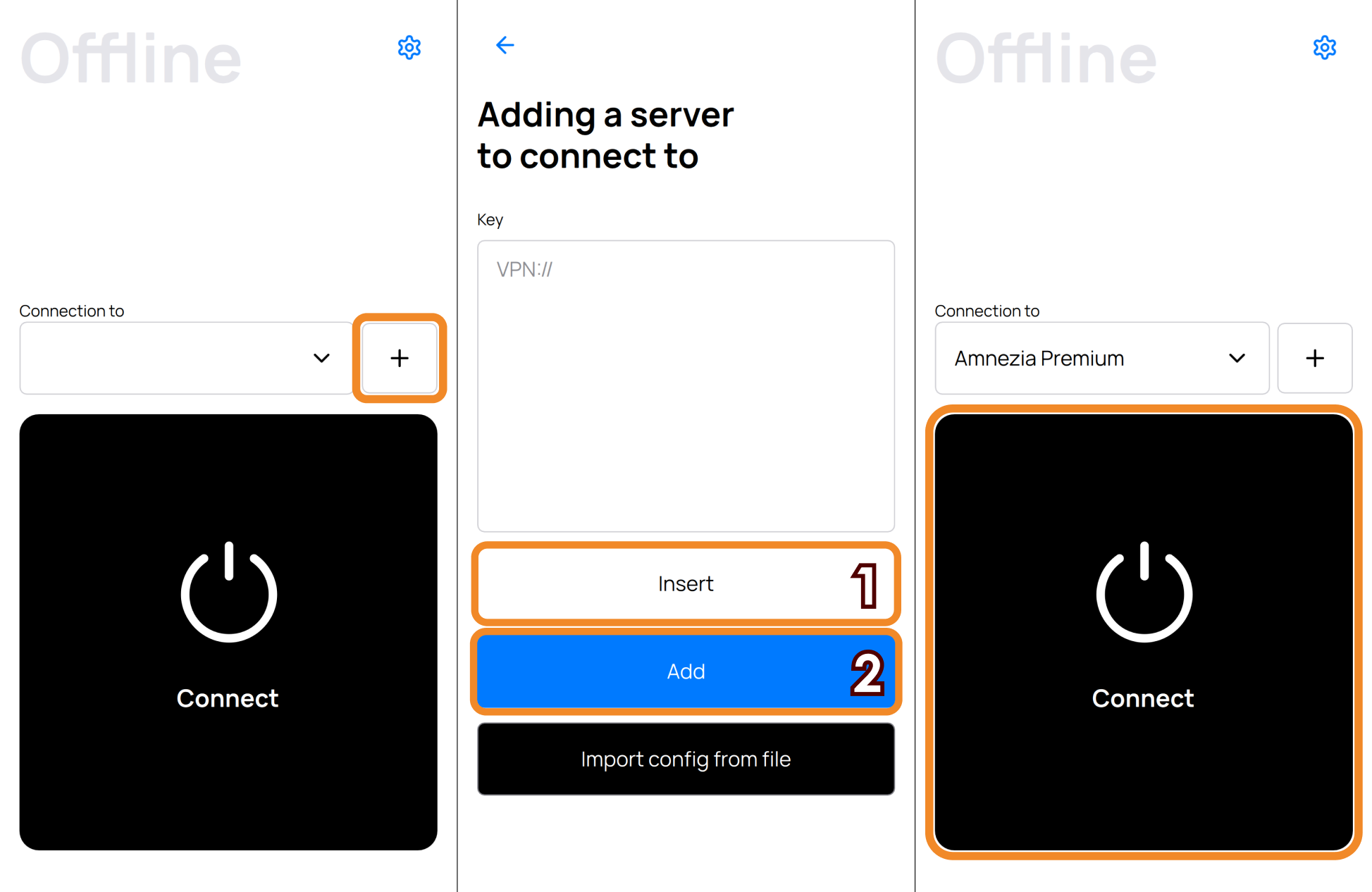 1. In the AmneziaVPN app, click ➕ (plus icon) or click Let's get started if you don't have any other connections.