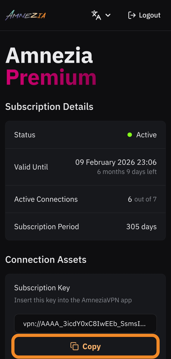 2. Copy your Subscription Key vpn:// from the Personal Dashboard (mirror) or from your order email.