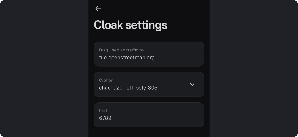 You can enter any website into this field. If DPI systems attempt to detect and intercept VPN traffic, they will see only this camouflage site instead of VPN traffic.