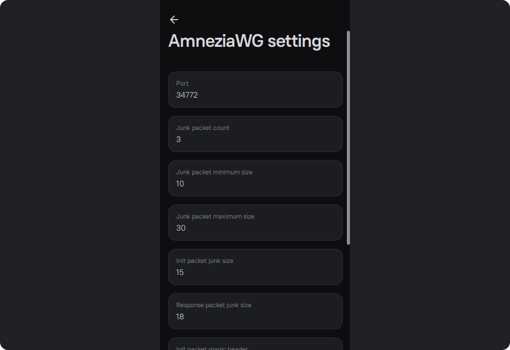 In the AmneziaWG settings, you can change the "Magic" headers and "Junk" packet sizes.