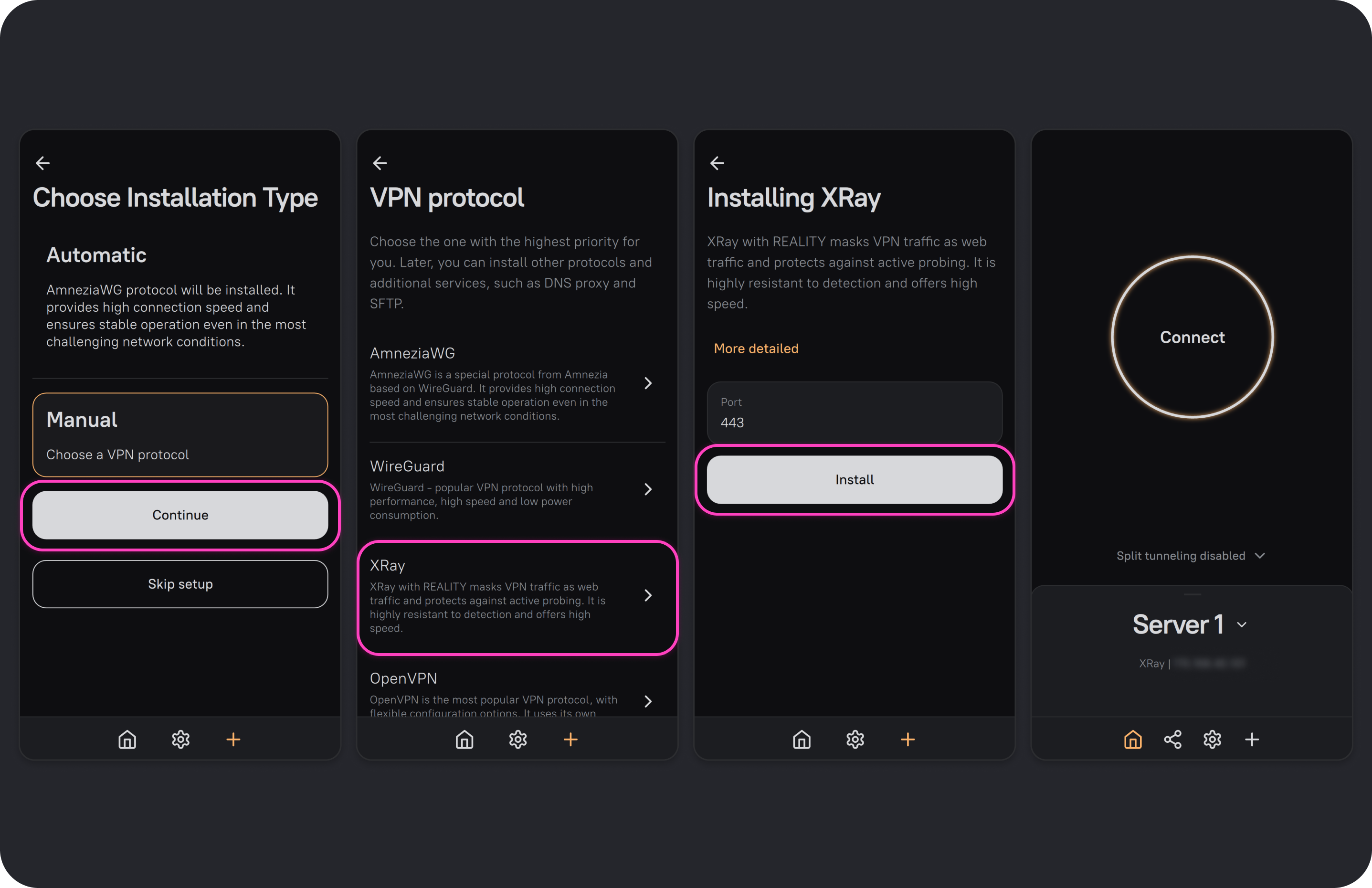 • Automatic — installs only the AmneziaWG protocol. Other protocols can be added later.