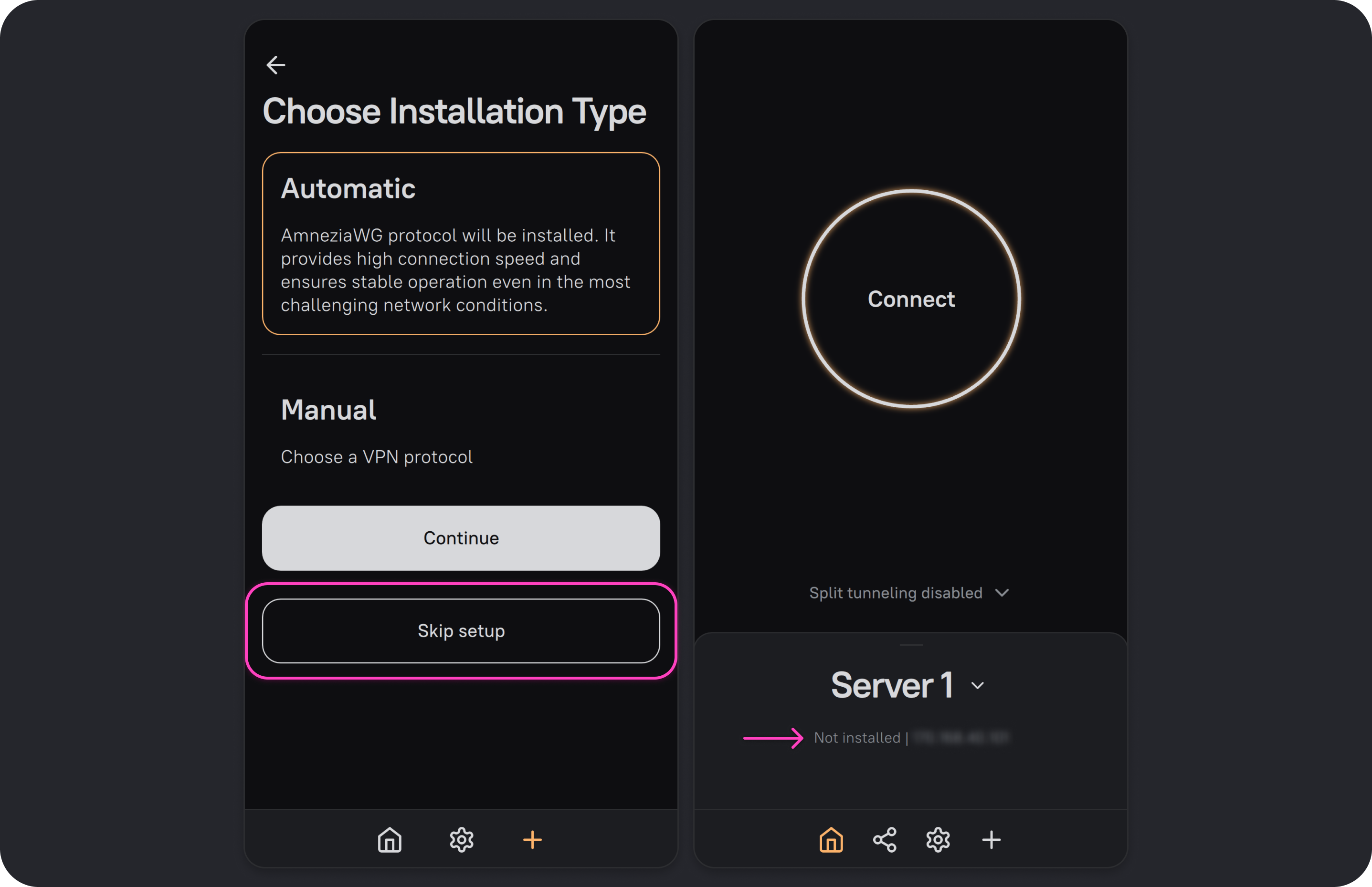 If you click Skip setup, AmneziaVPN creates an empty connection without running any commands on the server.