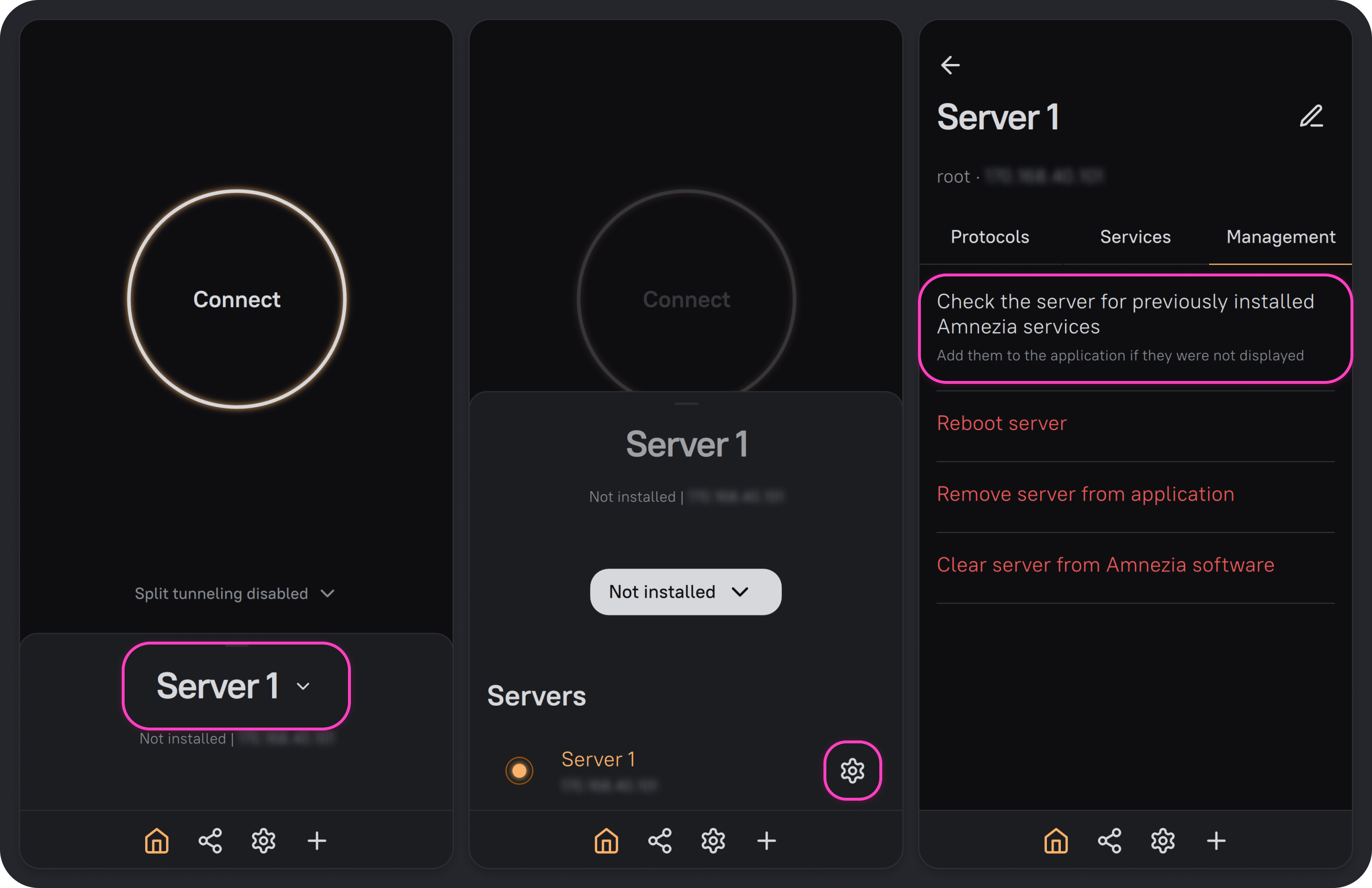 3. Go to ManagementCheck the server for previously installed Amnezia services.