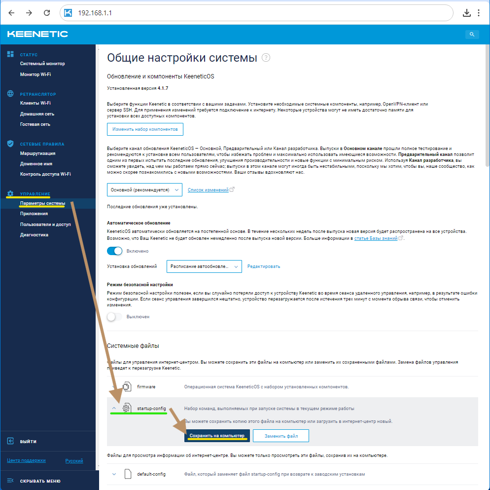 Сразу после авторизации перейдите в раздел Управление, далее Параметры системы, разверните пункт startup-config и сохраните резервную копию нынешних настроек вашего роутера.