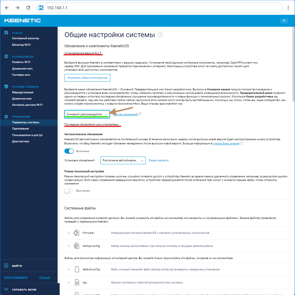 После чего выполните обновление роутера до версии 4.2 или новее, нажав кнопку Обновить KeeneticOS на странице Параметры системы. В процессе обновления роутер выполнит перезагрузку.