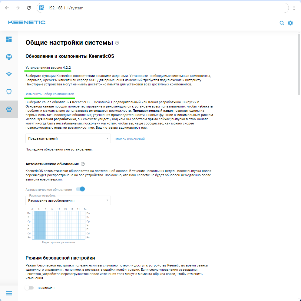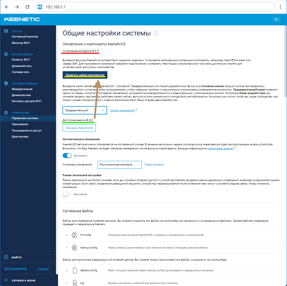 Если уже установлена версия KeeneticOS 4.2 или предлагается обновление до 4.2, проверьте наличие необходимого компонента системы. Нажмите кнопку Изменить набор компонентов.