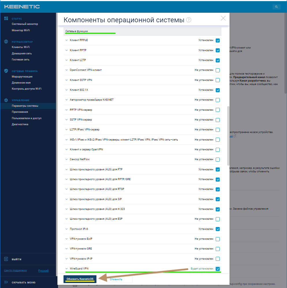 На открывшейся странице Компоненты операционной системы, в секции Сетевые функции, проверьте наличие установленного компонента WireGuard VPN. Если компонент WireGuard VPN не установлен, отметьте соответствующий чек-бокс для установки и нажмите появившуюся снизу кнопку Обновить KeeneticOS. Дождитесь, пока роутер обновится и перезагрузится.