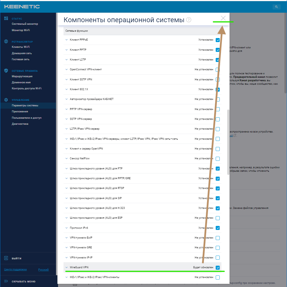Если компонент WireGuard VPN уже установлен, но нуждается в обновлении, закройте список компонентов, чтобы вернуться на страницу Параметры системы.