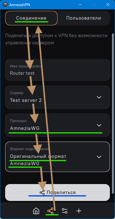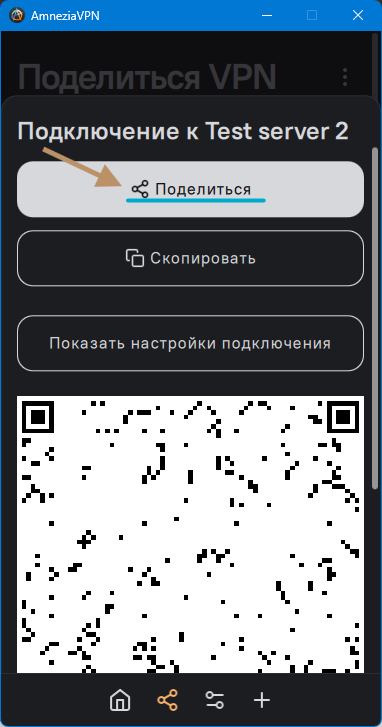 После генерации нового подключения AmneziaWG нужно сохранить его в виде файла. Для этого на следующем отобразившемся экране AmneziaVPN нажмите ещё одну кнопку Поделиться, расположенную сверху.