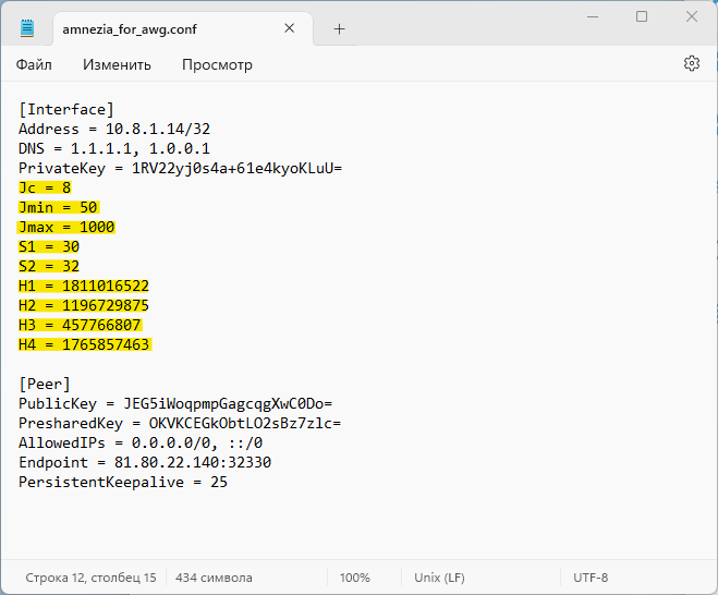 Теперь, зная имя интерфейса и значения параметров asc из файла в формате .conf, который мы сохранили ранее, нужно заменить все значения шаблона в скобках вашими зн ачениями, а сами скобки удалить.