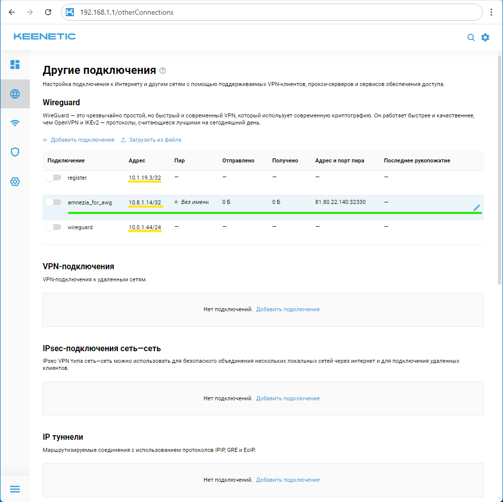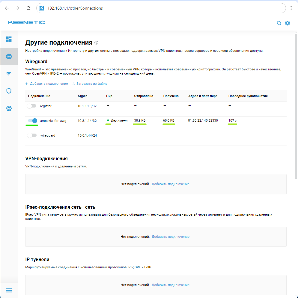 Теперь нужно перейти в раздел Интернет, далее Другие подключения, и проверить работоспособность созданного подключения WireGuard, переключив его состояние на Включено. Через несколько секунд отметка акти вности пира должна изменить цвет с серого на зелёный. Также должна отобразиться информация о входящем/исходящем трафике и о времени с последнего рукопожатия.