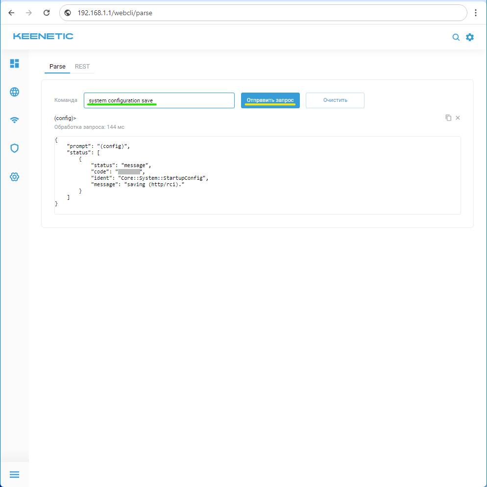 Теперь следует сохранить изменения в конфигурации роутера. Введите команду system configuration save и нажмите Отправить запрос. Если всё введено верно, ниже будет выведен результат обработки запроса как на приведённом скриншоте.