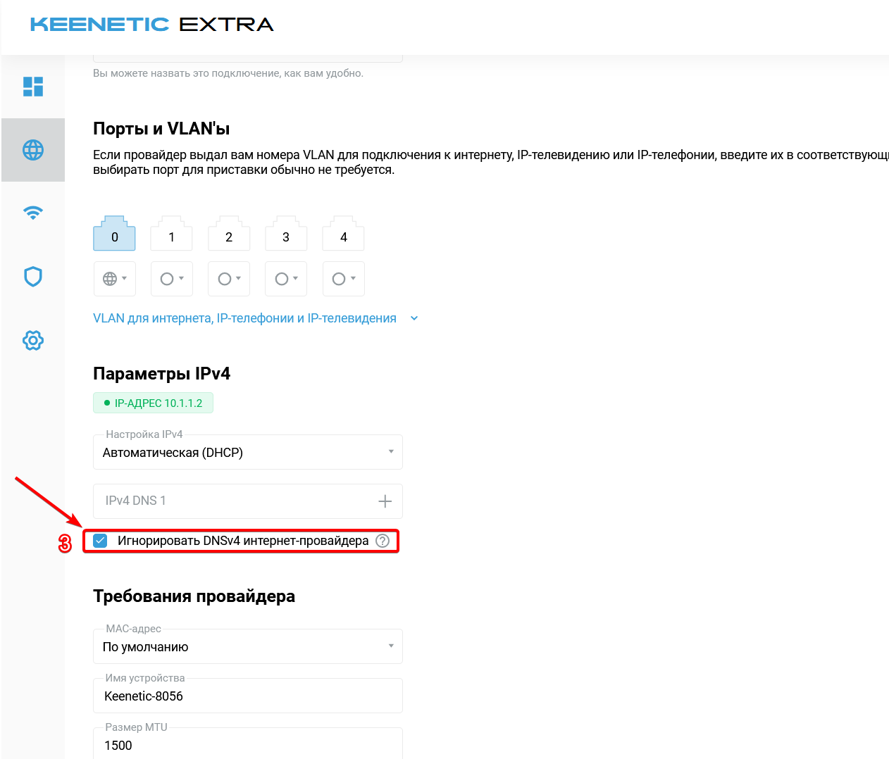В разделе Порты и VLANы поставьте галочку Игнорировать DNSv4 интернет-провайдера.
