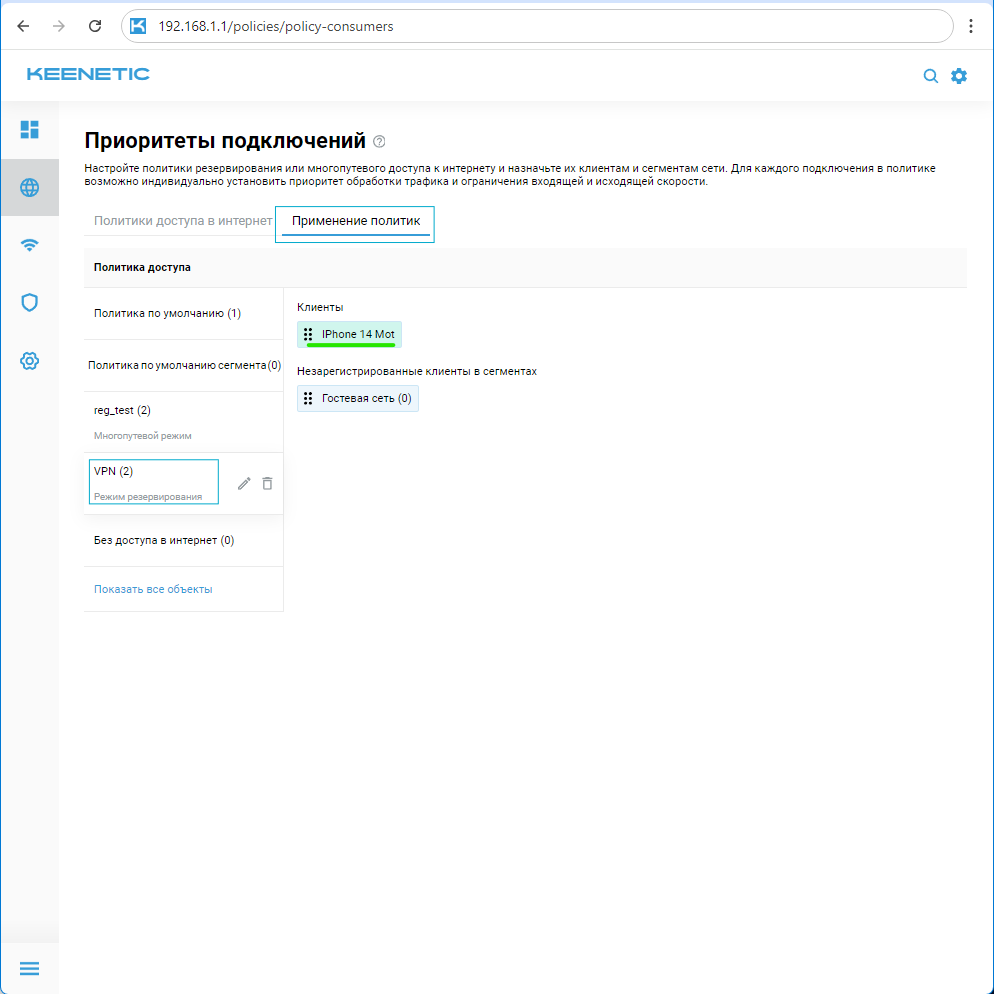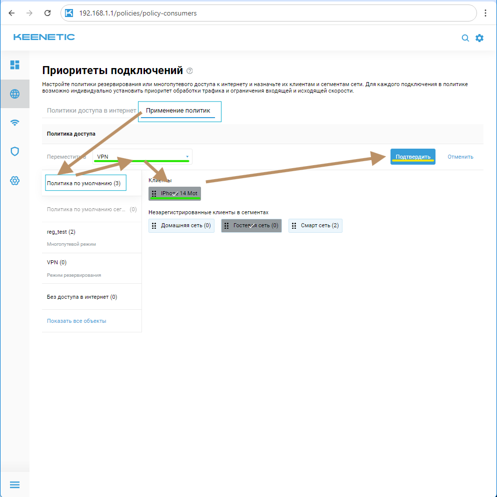 Также сегменты подключения устройств и зарегистрированные устройства можно просто перетаскивать на пункт с названием нужной политики доступа.