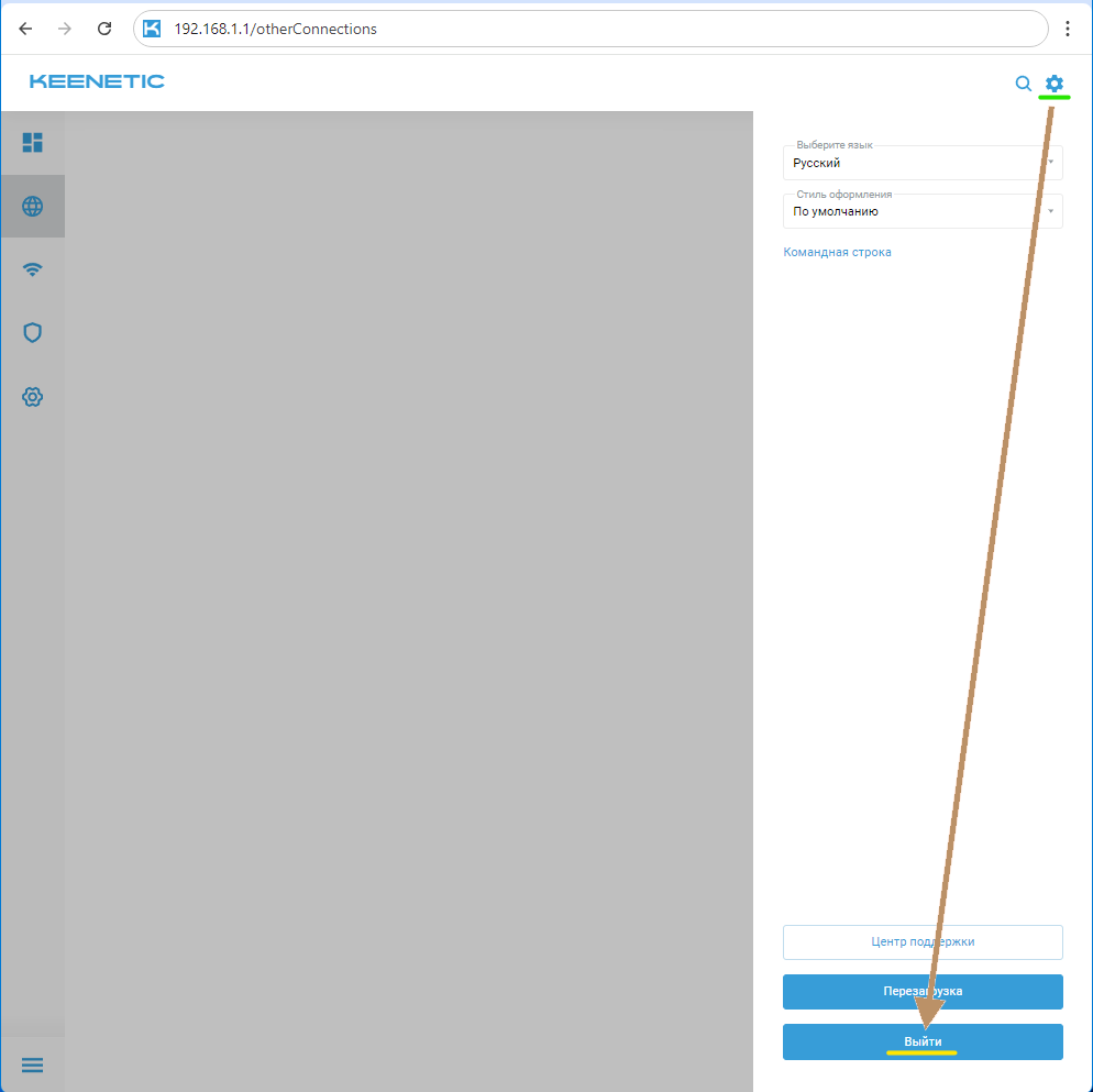 Теперь вы можете выйти из настроек роутера. Нажмите на шестерёнку в правом верхнем углу страницы, а затем нажмите кнопку Выйти в правом нижнем углу страницы.
