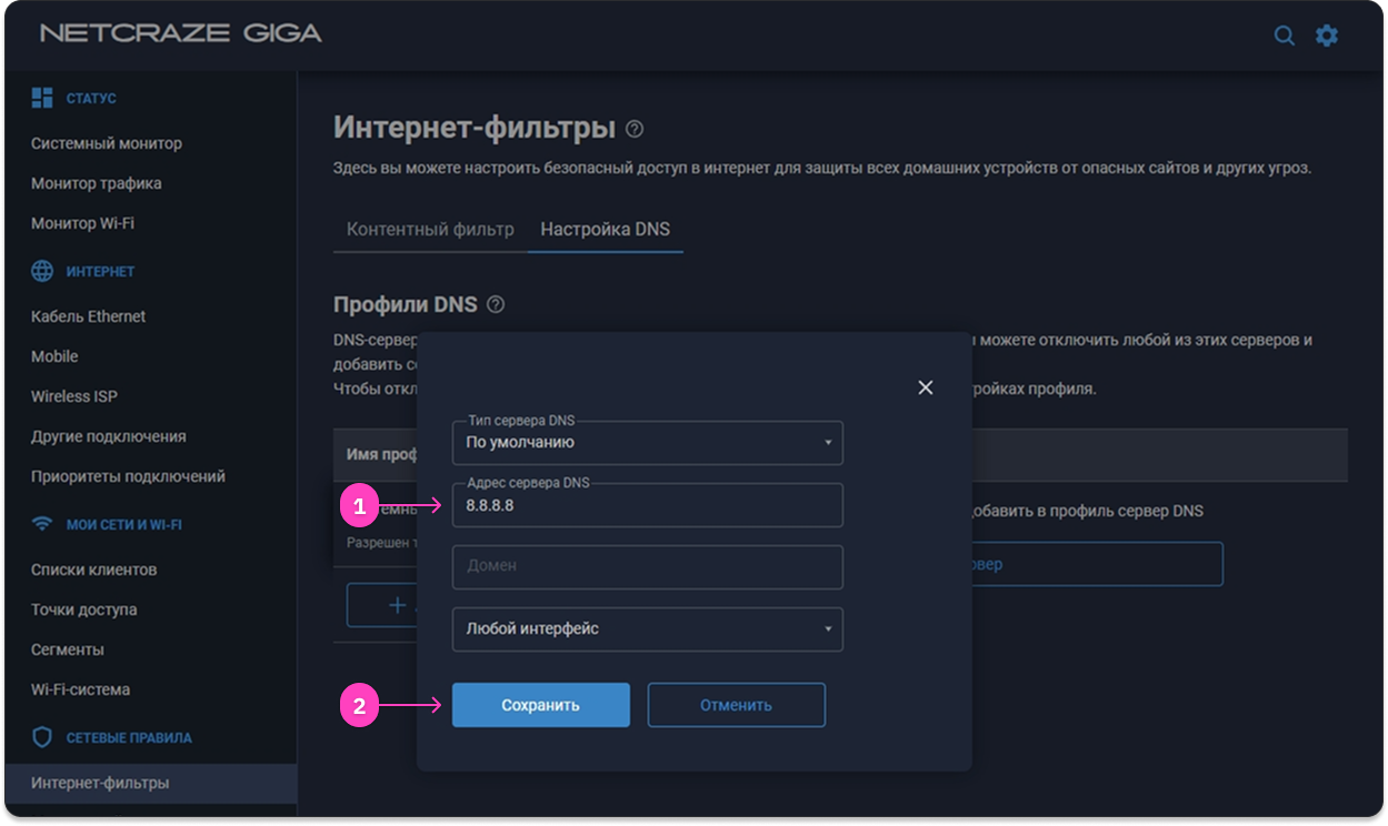 - Перейдите в Интернет-фильтры в разделе 🛡️ Сетевые правила, далее перейдите на вкладку Настройка DNS и нажмите Добавить сервер.