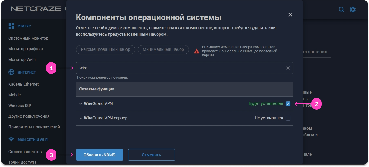 wireguard, поставьте галочку для WireGuard VPN, нажмите Обновить NDMS и подтвердите внесение изменений. Если вы ещё не сд елали резервную копию, сделайте её сейчас. Если уже сделали, её повторное создание остаётся на ваше усмотрение.