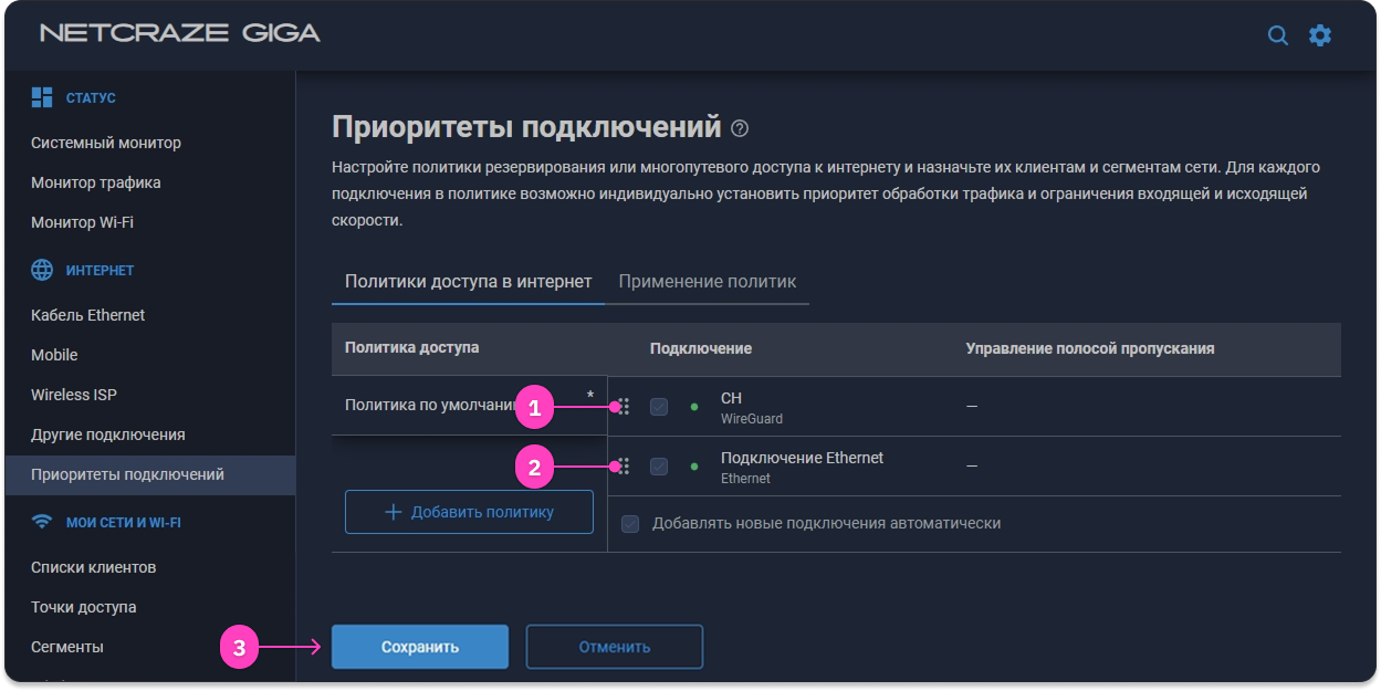 - В Политике по умолчанию переместите основное интернет-подключение выше созданного WireGuard-подключения, чтобы весь трафик по умолчанию шёл через него.