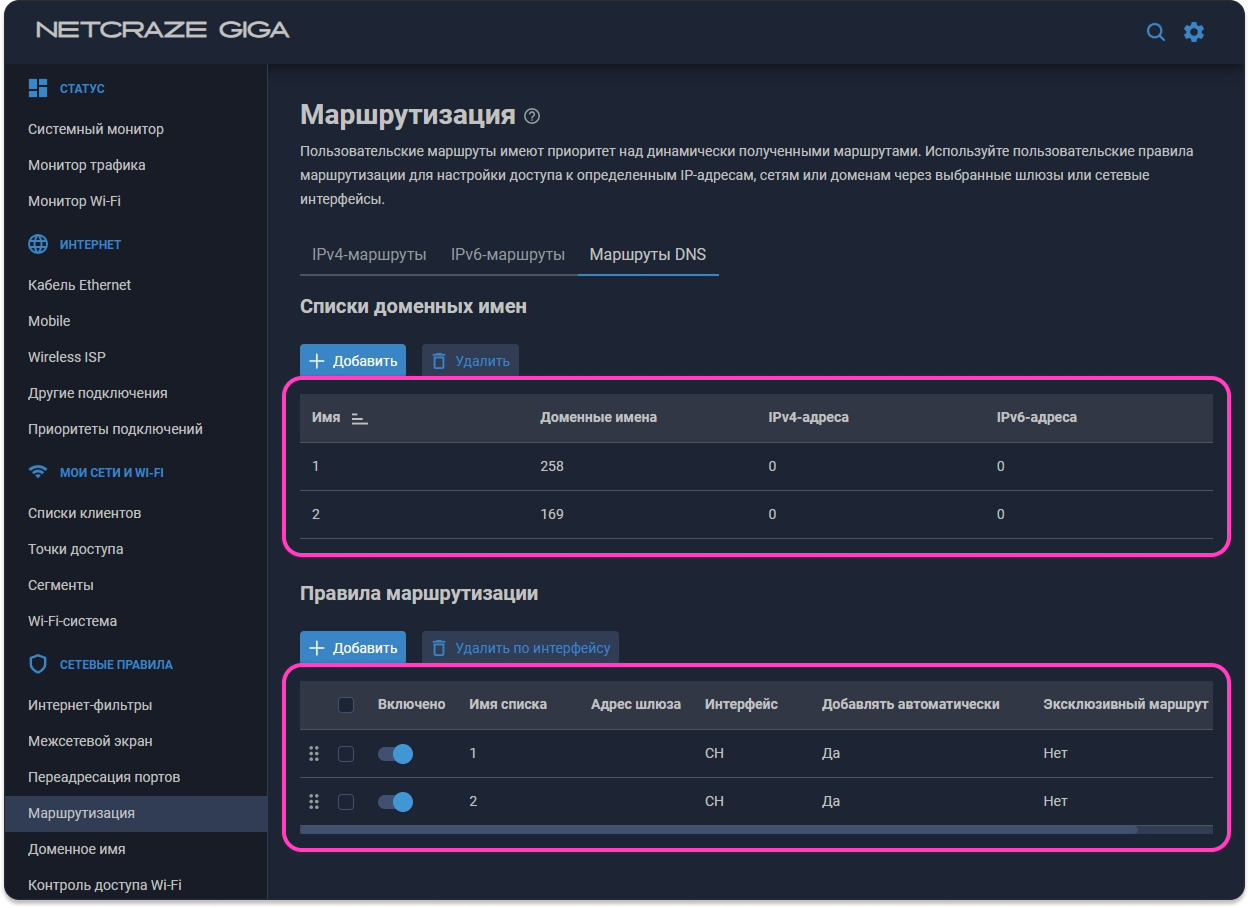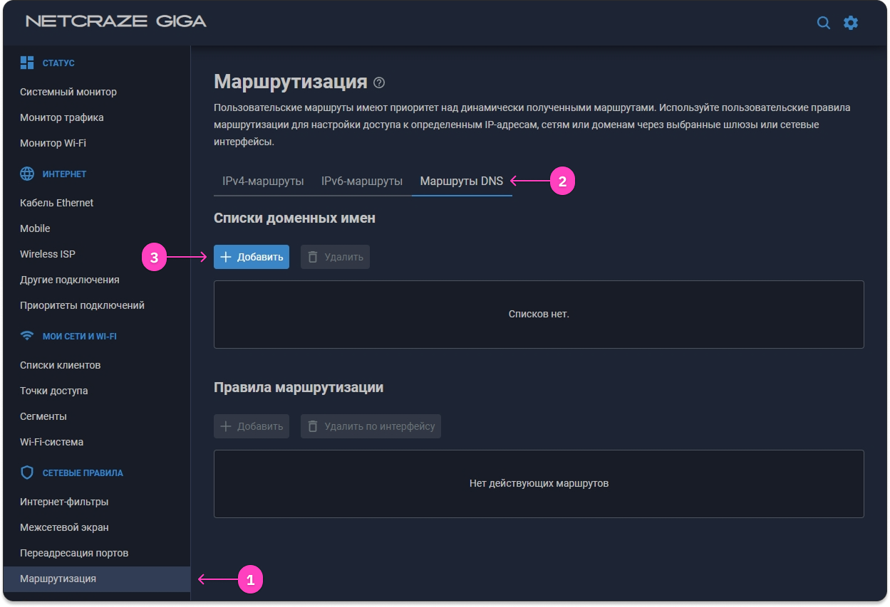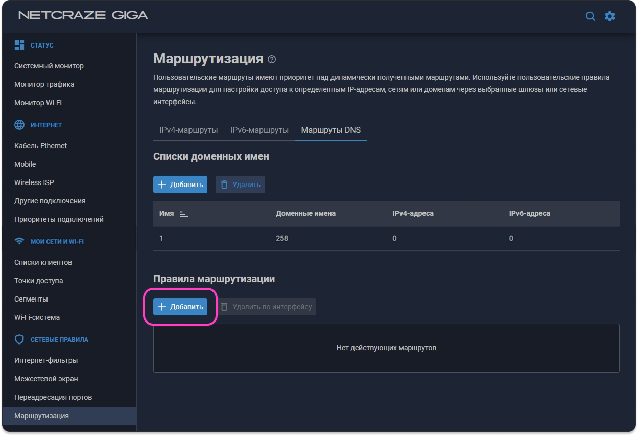 - Перейдите в Маршрутизацию в разделе 🛡️ Сетевые правила, далее перейдите на вкладку Маршруты DNS и нажмите Добавить в блоке Списки доменных имен.