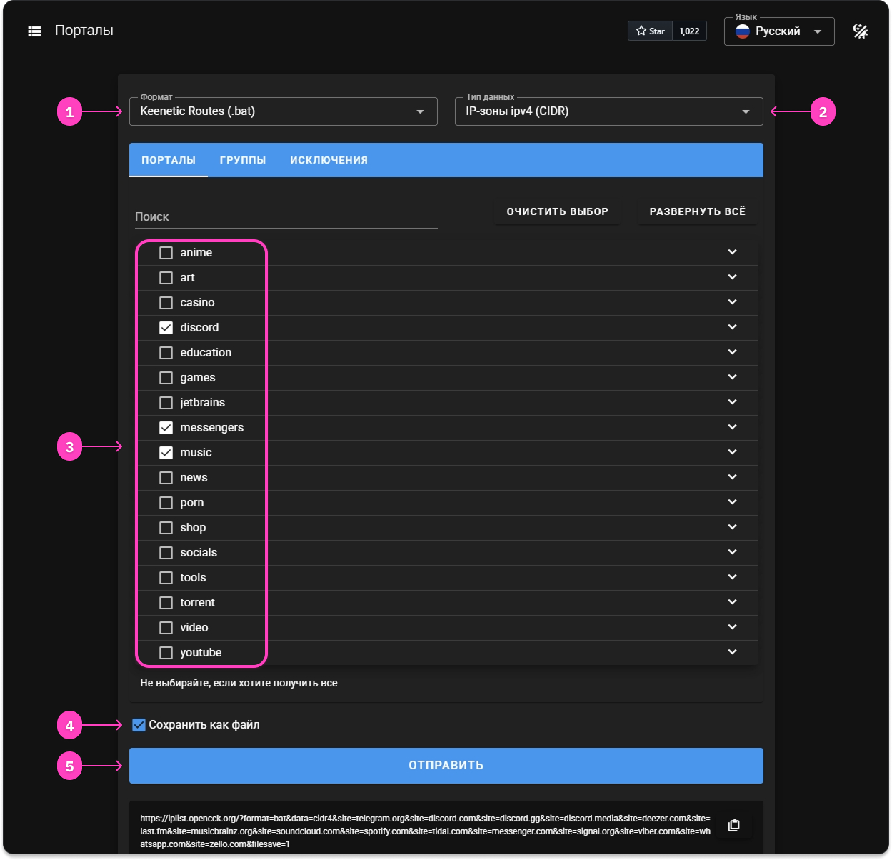 Выберите формат Keenetic Routes (.bat) и тип данных IP-зоны ipv4 (CIDR), отметьте галочками нужные порталы, поставьте галочку Сохранить как файл и нажмите Отправить, чтобы скачать файл.