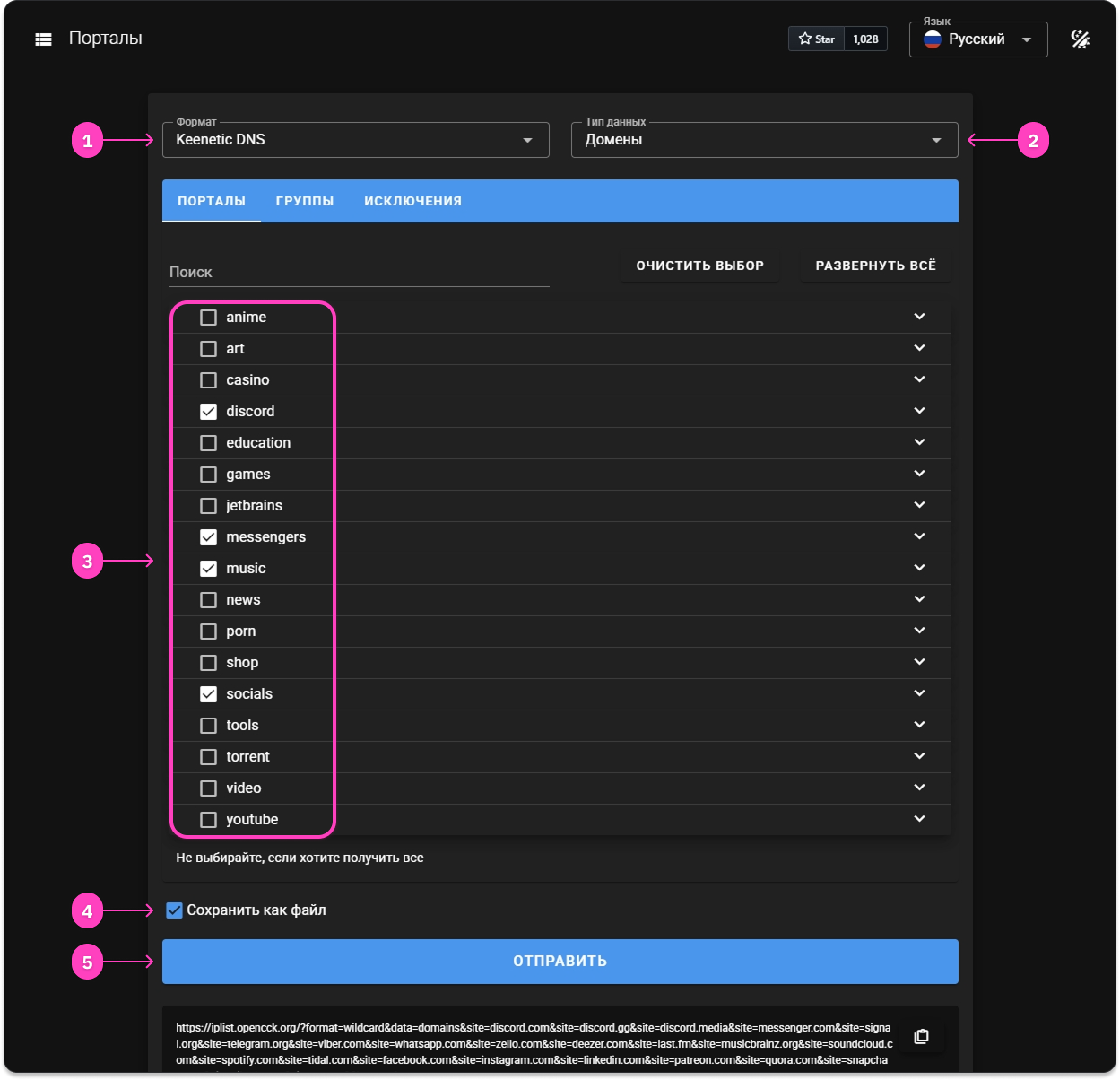 Выберите формат Keenetic DNS и тип данных Домены, отметьте галочками нужные порталы, поставьте галочку Сохранить как файл и нажмите Отправить, чтобы скачать файл.