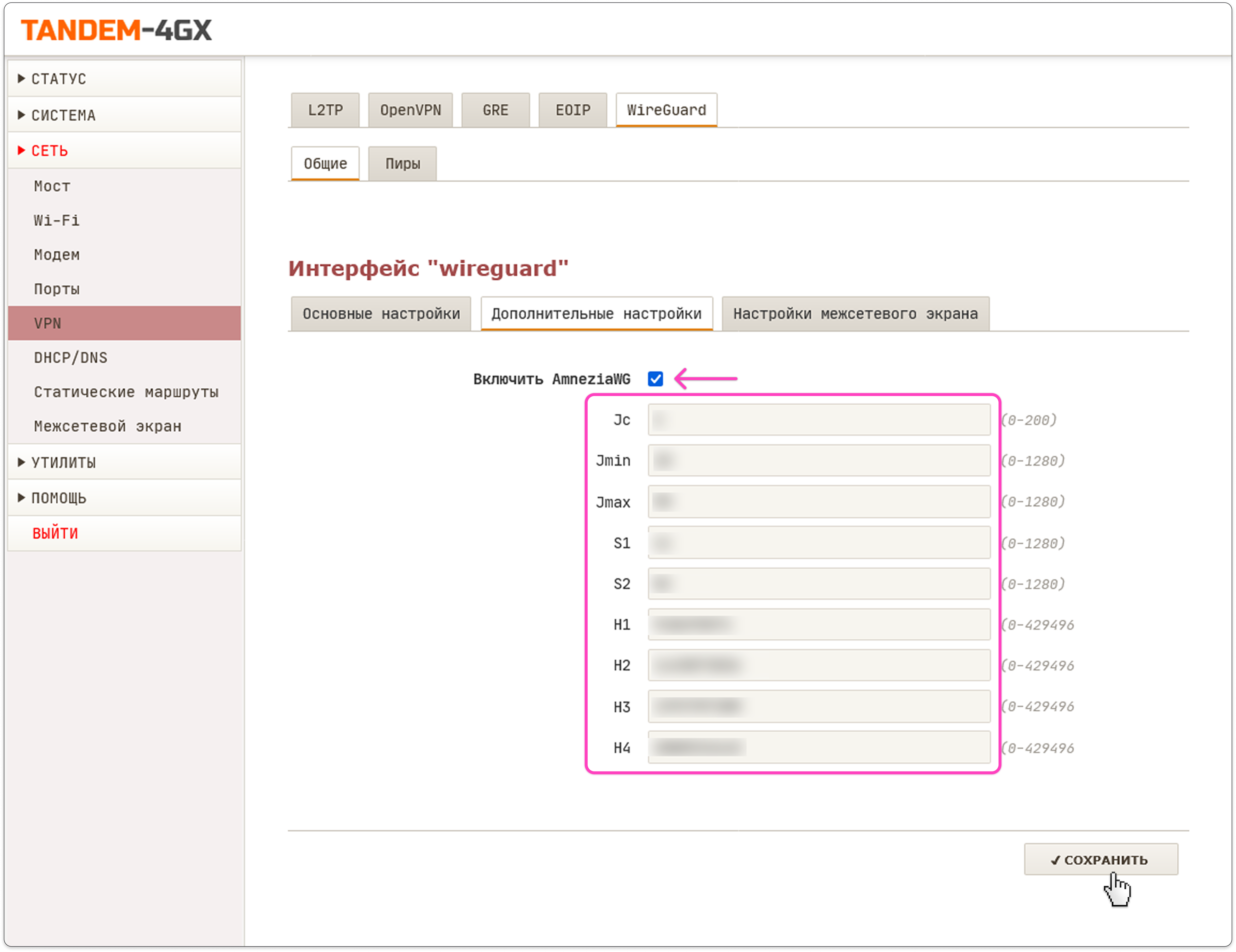 - На вкладке Дополнительные настройки поставьте галочку Включить AmneziaWG и заполните все появившиеся строки значениями соответствующих параметров из файла конфигурации