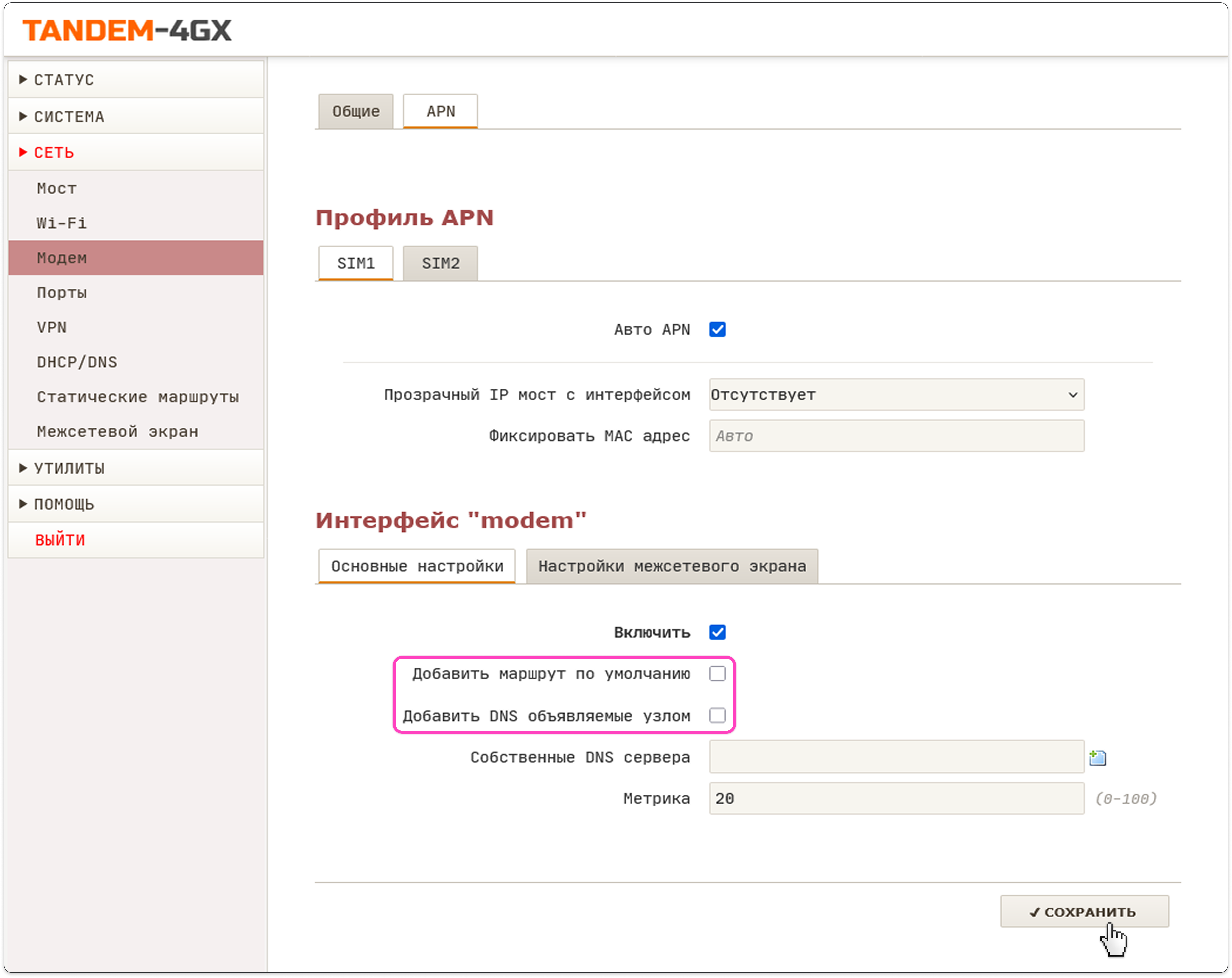 - Перейдите в раздел Модем → вкладка APN и снимите галочки возле пунктов Добавить маршрут по умолчанию и Добавить DNS, объявляемые узлом.