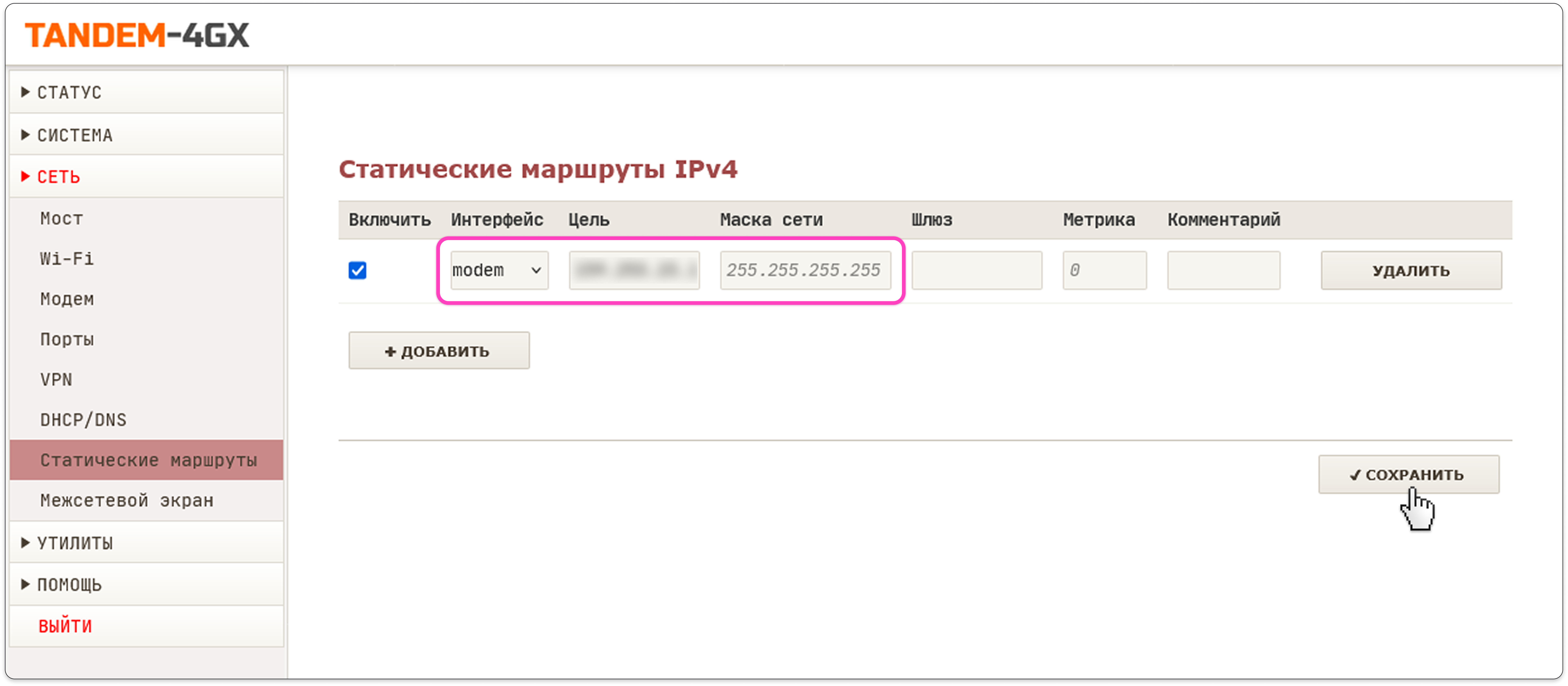 - Перейдите в раздел Сеть → Статические маршруты → нажмите кнопку Добавить → укажите параметры маршрута и нажмите кнопку Сохранить: