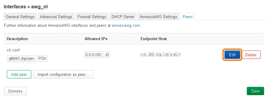 - Open the Peers tab → click Edit to the right of the configuration file you imported earlier.