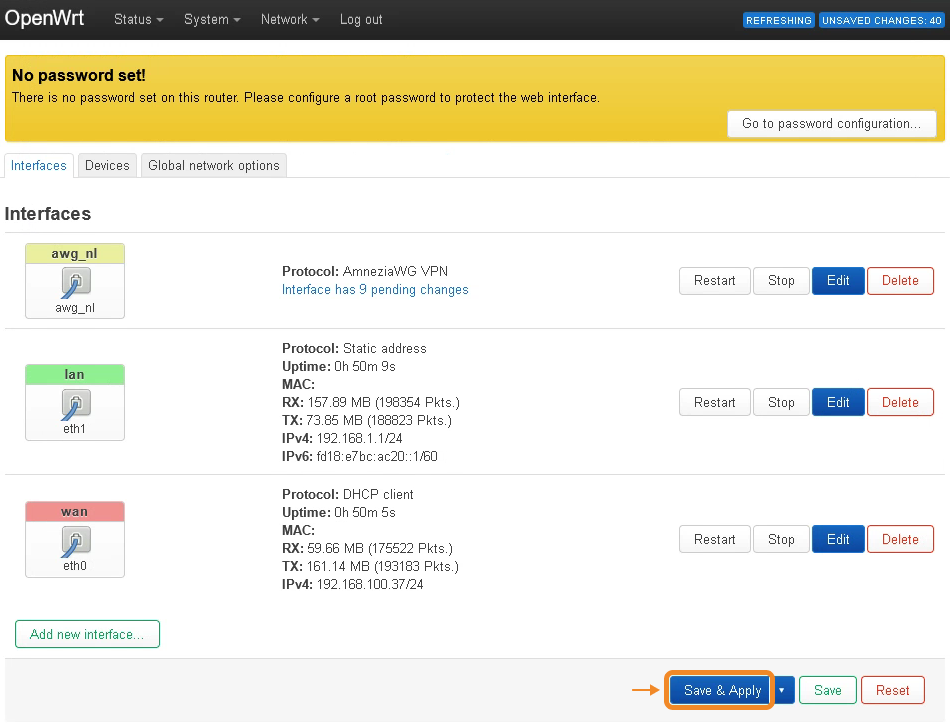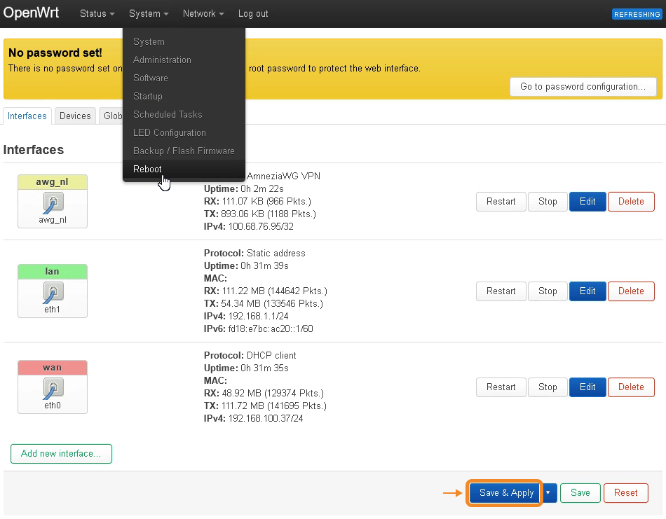 - In the window that appears, while on the Interfaces tab, click Save & Apply → go to System in the top-menu → Reboot.