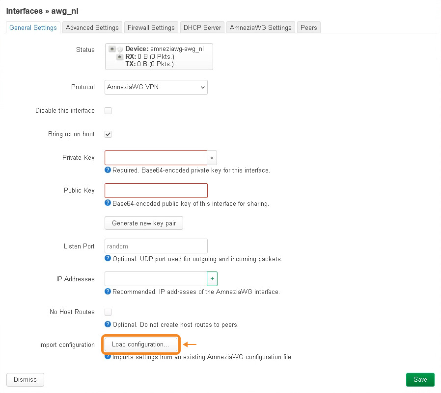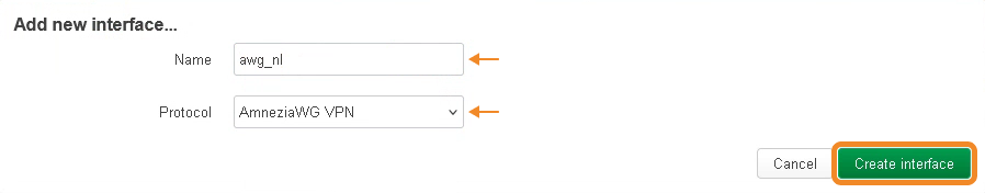 - Enter a name for your VPN interface and select AmneziaWG VPN as the protocol → click Create interface.