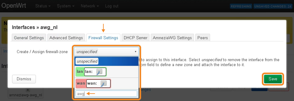- Go to the Firewall Settings tab → click the Create / Assign firewall-zone drop-down list → enter a name for the new zone in the field below the zone list → press Enter → click Save.