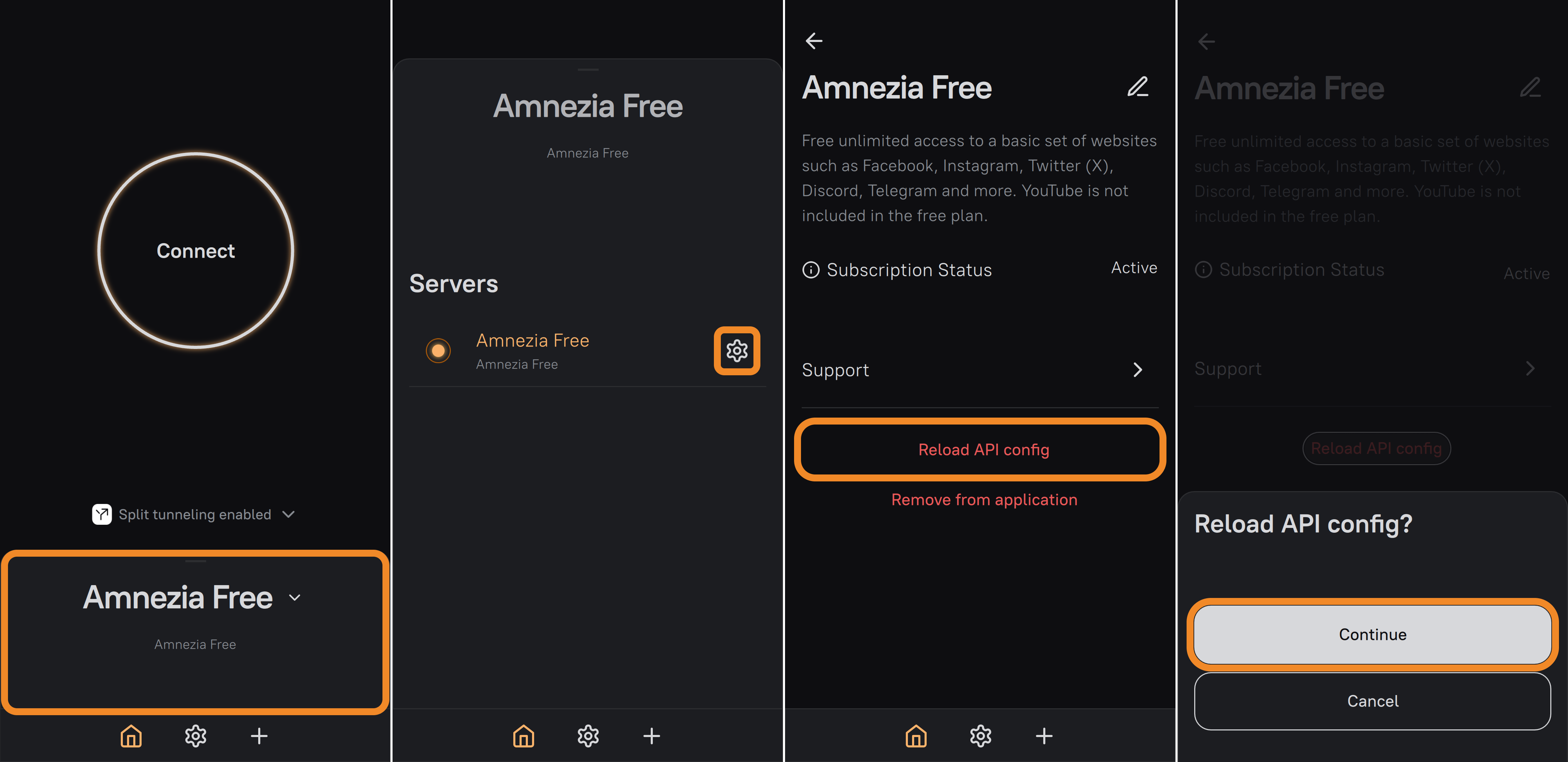 - Click ⚙️ (gear icon) to the right of the Amnezia Free connection name.