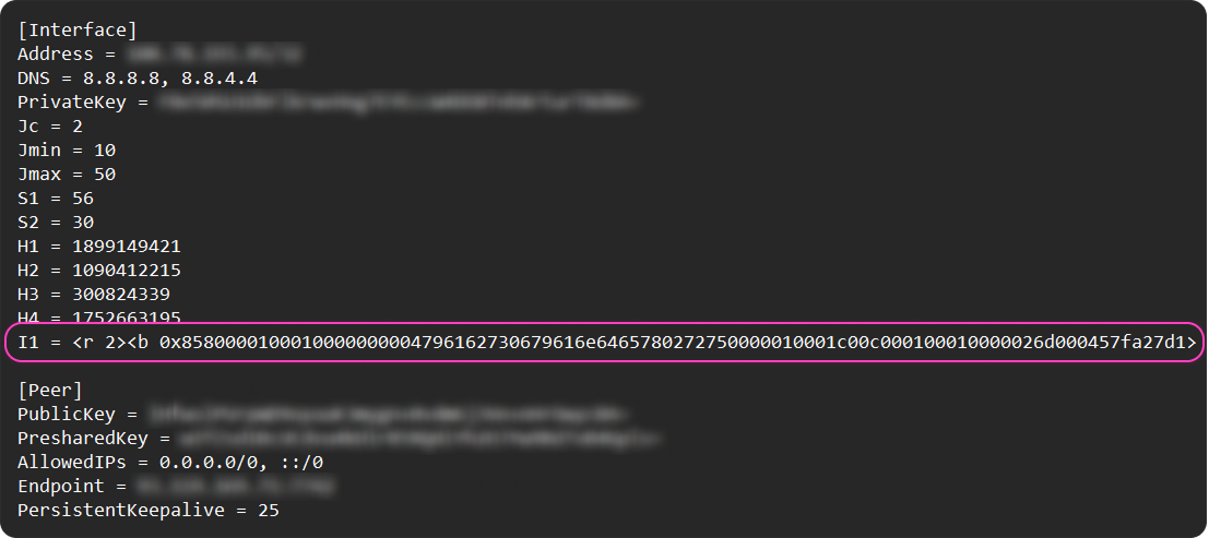 If you have a .conf configuration file for the AmneziaWG 1.0 protocol and want to improve your connection's resistance to blocking, you can manually convert it to the AmneziaWG 1.5 format. All it takes is adding the I1 parameter — a traffic masking packet.