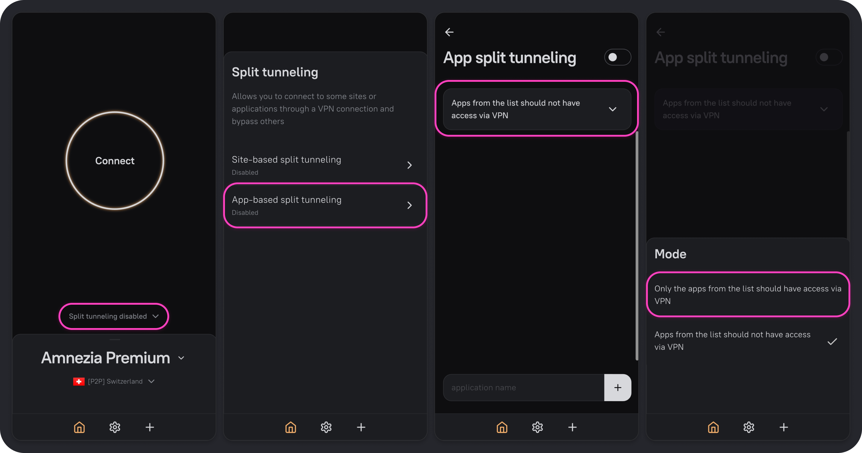 - Open App-based split tunneling and choose the mode you need.