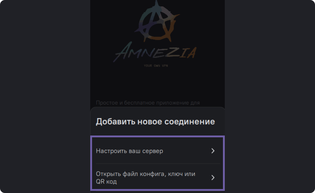 Далее следуйте подсказкам приложения или обратитесь к соответствующим разделам инструкции. Если у вас есть IP, login и пароль, перейдите к инструкции установка VPN на свой сервер. Если у вас другие данные — к подключению через файл, ключ в виде текста или QR-код.