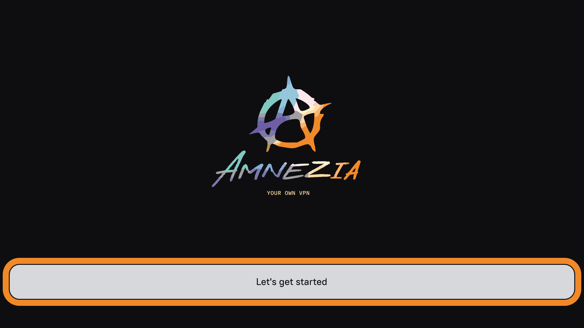 - Перейдите в приложение AmneziaVPN на Android TV и нажмите кнопку Let’s get started.