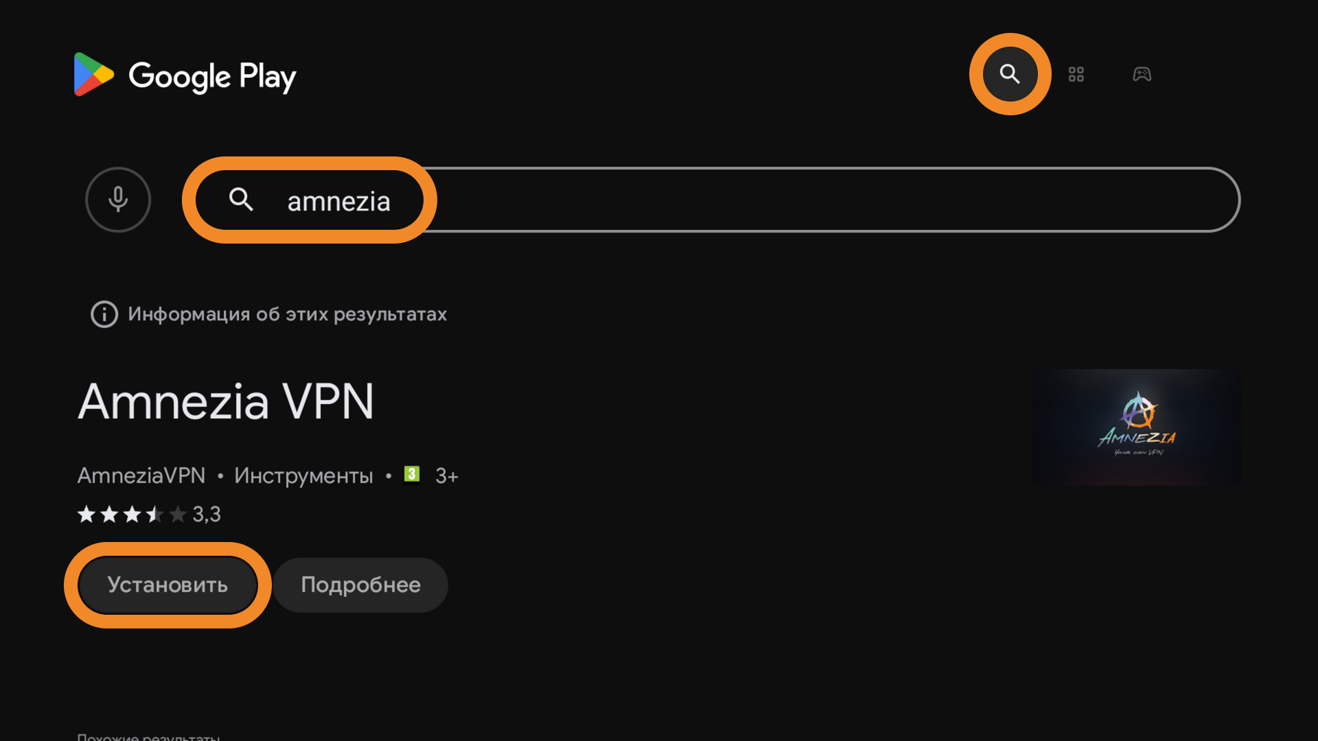 - Введите название приложения AmneziaVPN в поисковой строке и установите его.