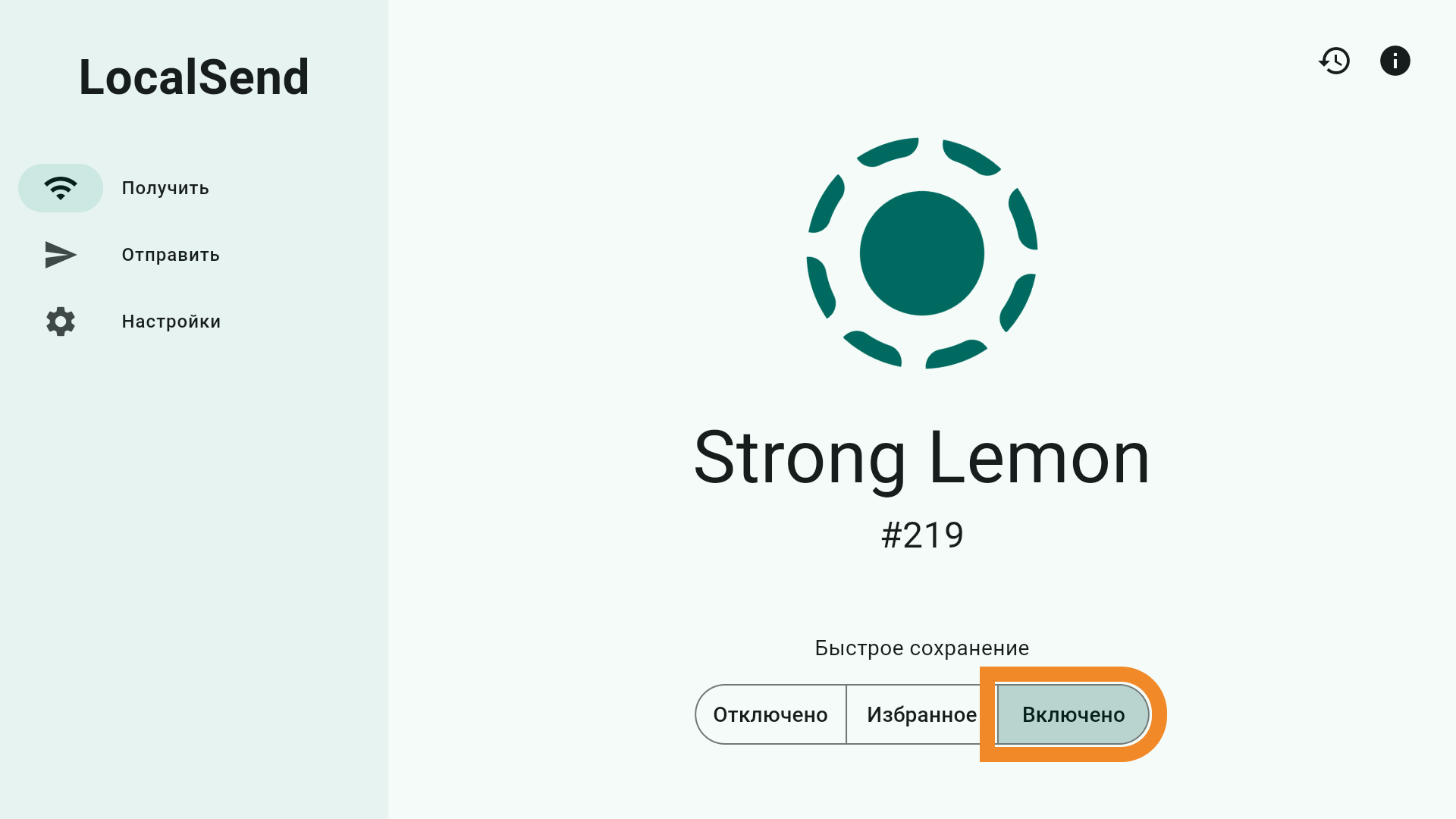 - Откройте приложение LocalSend и нажмите кнопку Включено — приложение готово для получения ключа с дру гого устройства.