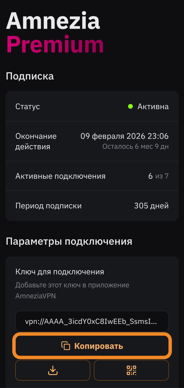 - Зайдите в личный кабинет Amnezia Premium на втором устройстве. Если вы уже авторизованы в нём, в разделе Параметры подключения нажмите кнопку Копировать возле ключа подключения — ключ скопируется в буфер обмена.