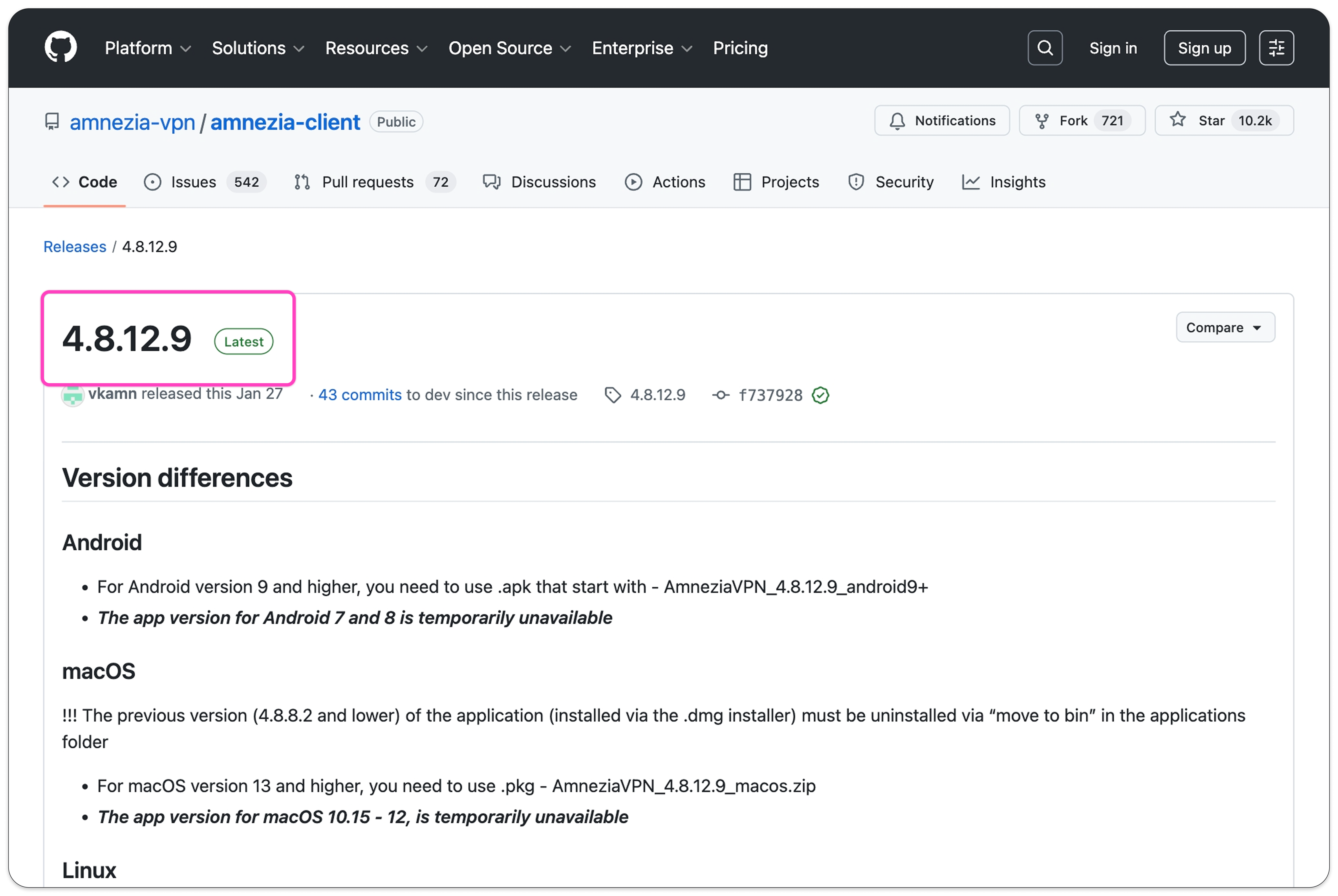 Если у вас более старая версия, чем на GitHub, рекомендуем обновиться. Например, у вас AmneziaVPN 4.8.11.4, а на GitHub доступна 4.8.12.9.