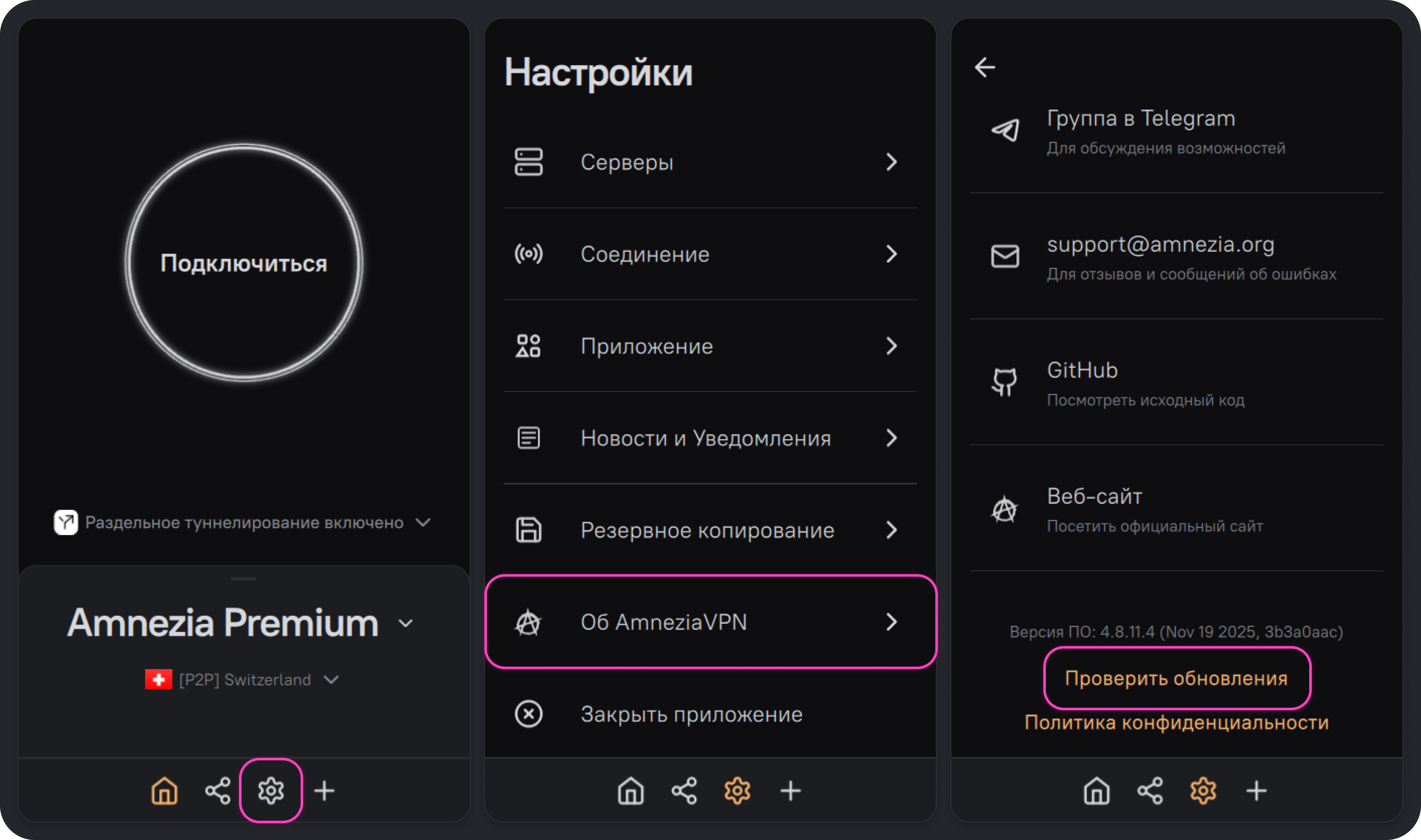 Ниже мы последовательно опишем все шаги, необходимые для проверки наличия новой версии приложения AmneziaVPN и его обновления.