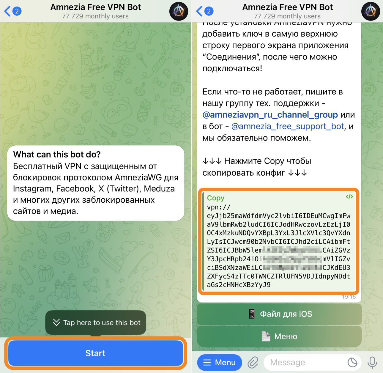 - Нажмите кнопку Start в чате с ботом, в ответ вы получите сообщение с ключом подключения (vpn://...).