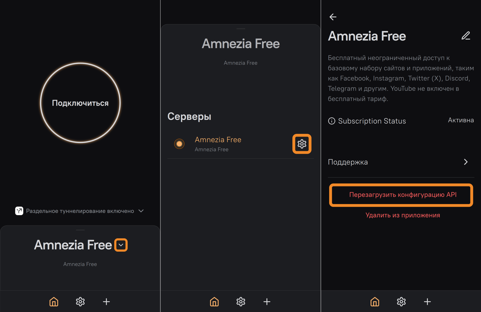 - Нажмите на иконку ⚙️ (шестерёнка) справа от подключения Amnezia Free, с которым возник ла проблема.